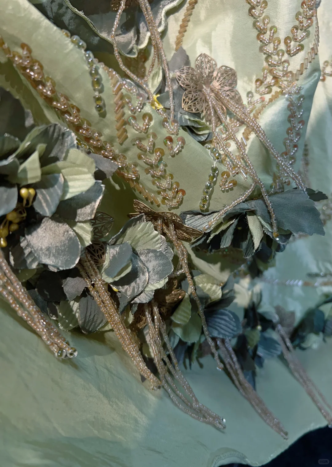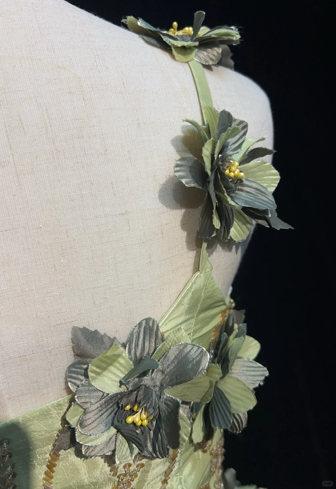 Vintage Green A Line Spaghetti Straps Beaded 3D Flower Satin Prom Dress Evening Dress HZ1023