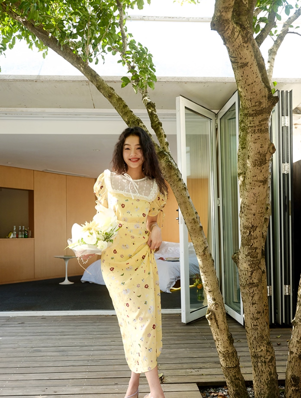 Cute A Line Puff Print Floral Lace Yellow Chiffon Summer Dress Party Dress Outfits HZ1023