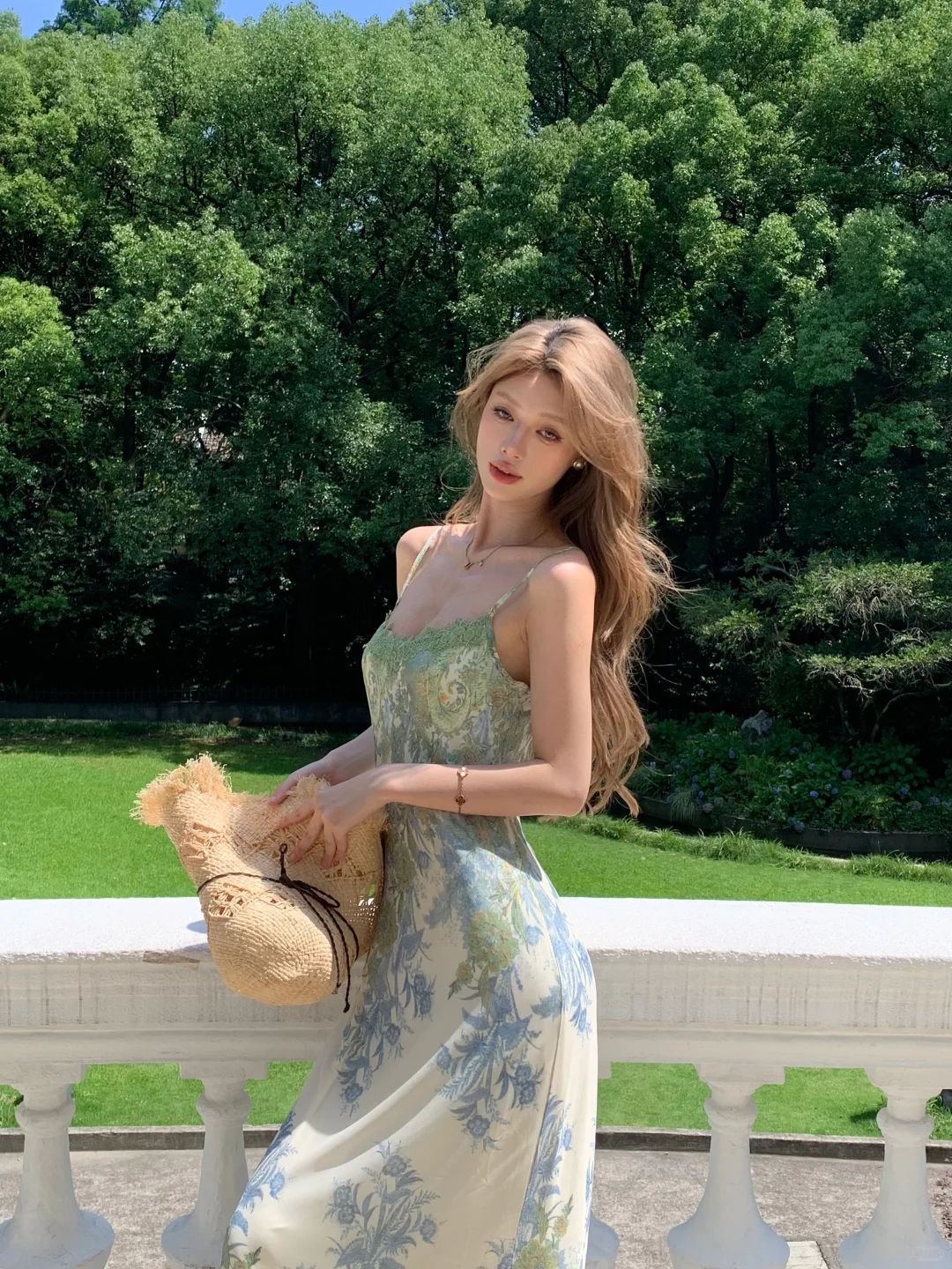 Elegant A Line Spaghetti Strap Green Print Floral Chiffon Prom Dress Evening Dress HZ1023