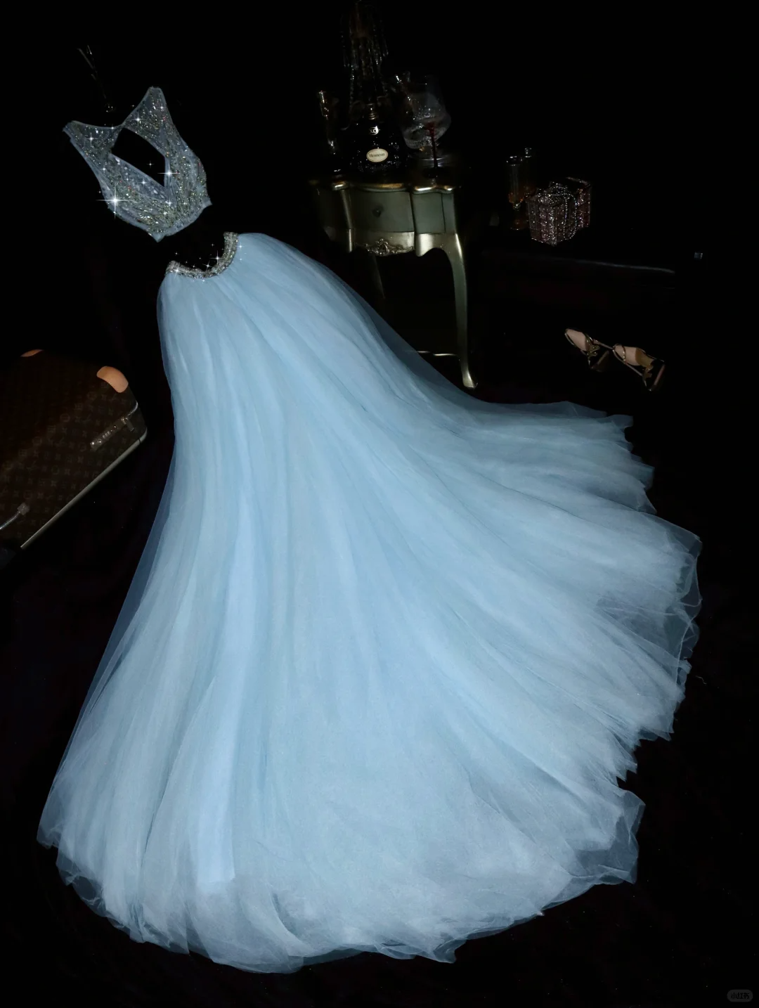 Shiny A Line V Neck Two Piece Beaded Baby Blue Tulle Long Prom Dress Evening Dress HZ1023