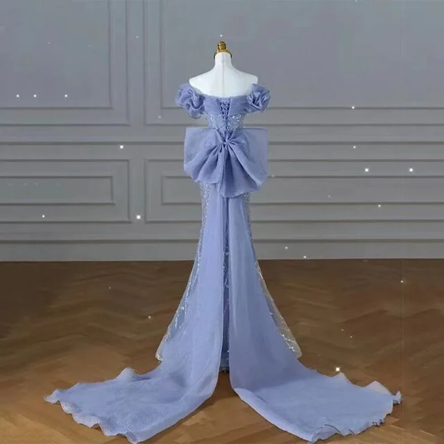 Sparkly Blue Prom Dress With Bow Sequins Off The Shoulder Mermaid Evening Gown HZ1023