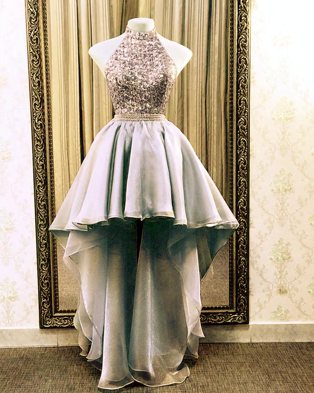 High Low Sequin Organza Prom Dresses Halter Backless Formal Evening Party Gown Dress HZ1023