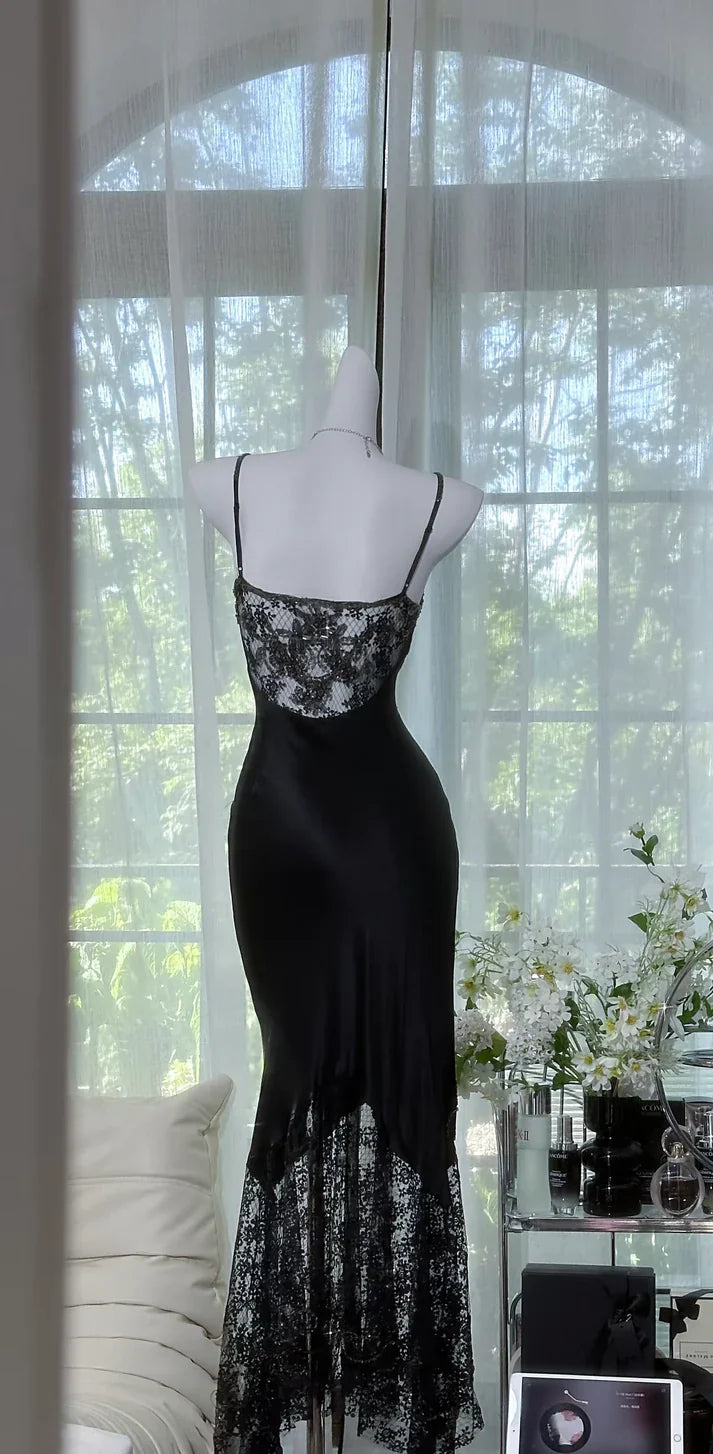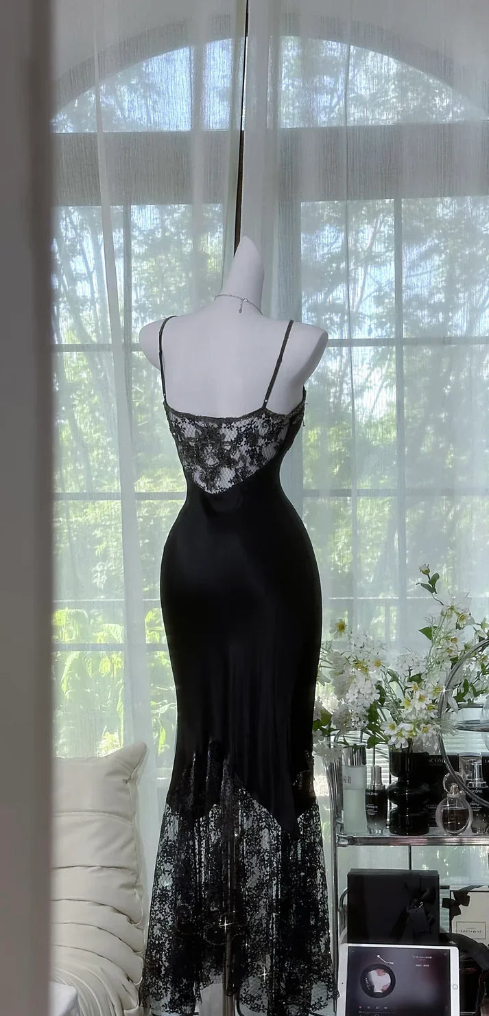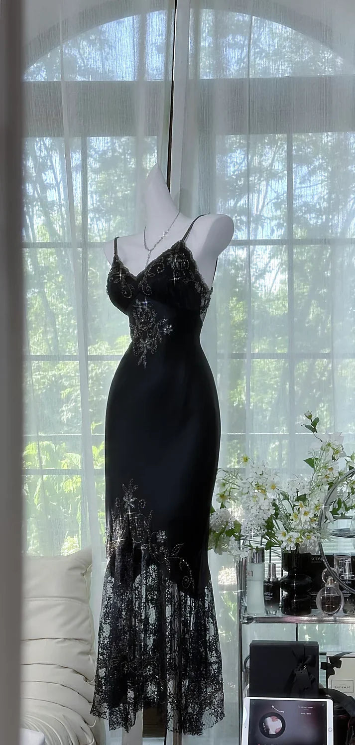 Sexy Black Mermaid Spaghetti Strap Beaded Lace Chiffon Evening Dress Party Dress HZ1023