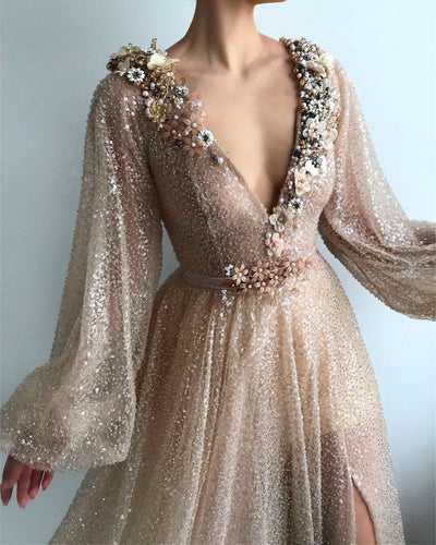 SPARKLE SEQUINS LONG SLEEVESS PROM PARTY GOWNS