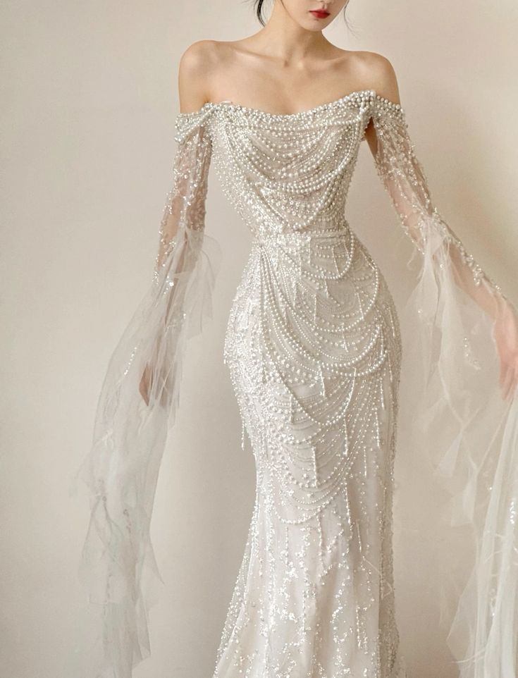 Stunning White Pearl Mermaid Long Sleeve Sequin Tulle Evening Dress Party Dress Wedding Dress HZ1023