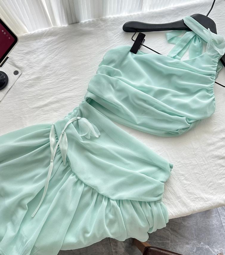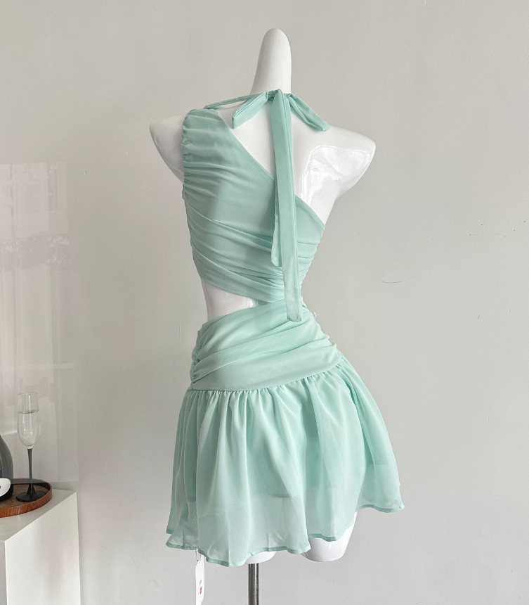 Mint Green A Line Halter Flower Chiffon Short Homecoming Dress Cocktail Dress HZ1023