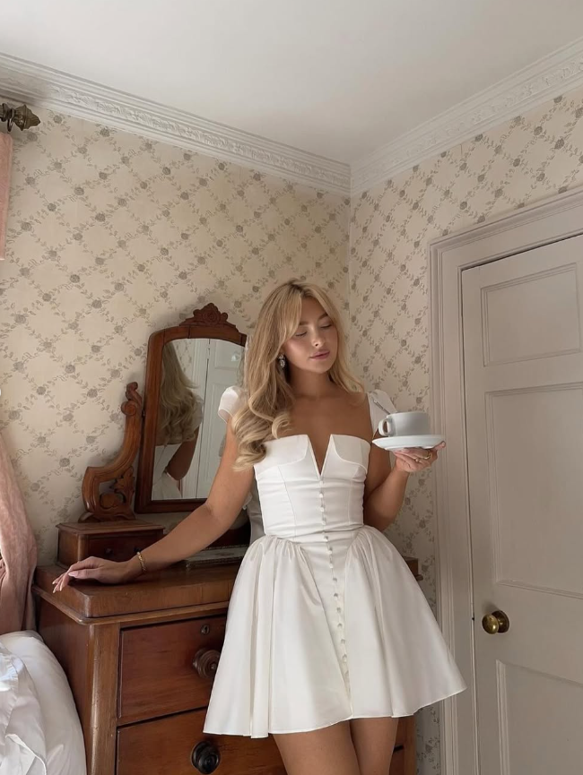Princess A Line V Neck White Satin Short Homecoming Dress Birthday Dress HZ1023