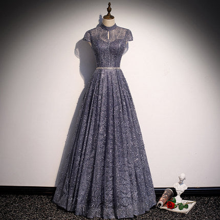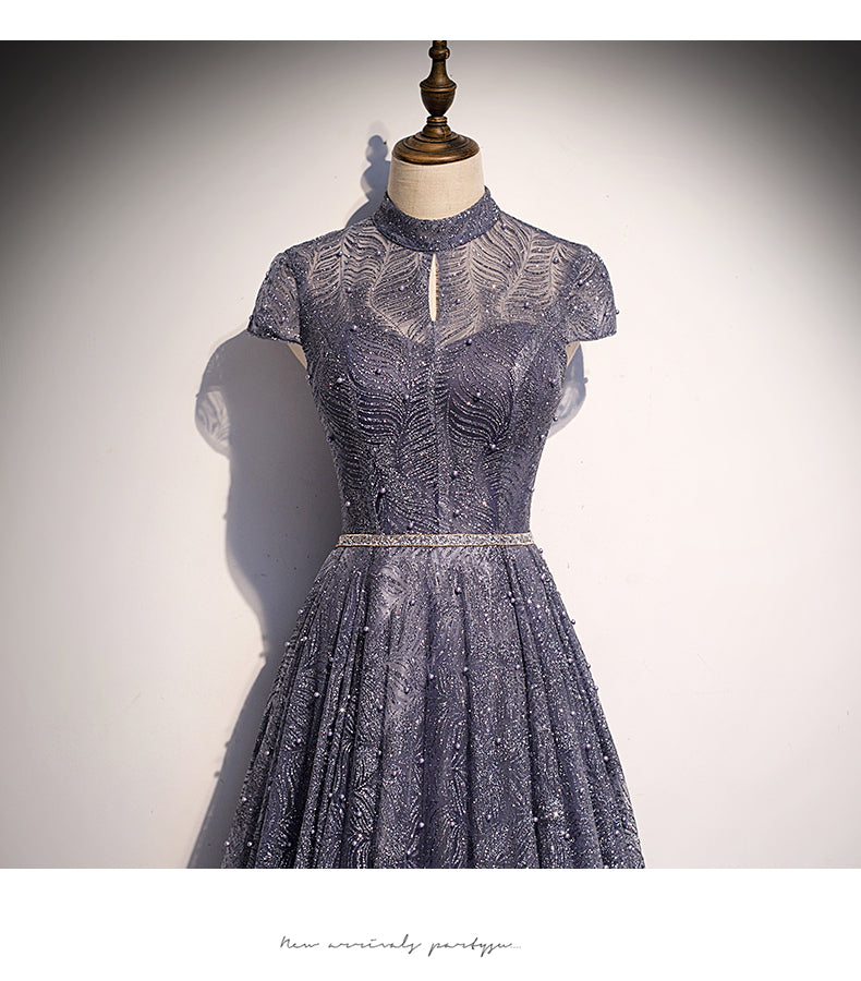 Princess High Neckline Short Sleeves Long Prom Dresses HZ1023