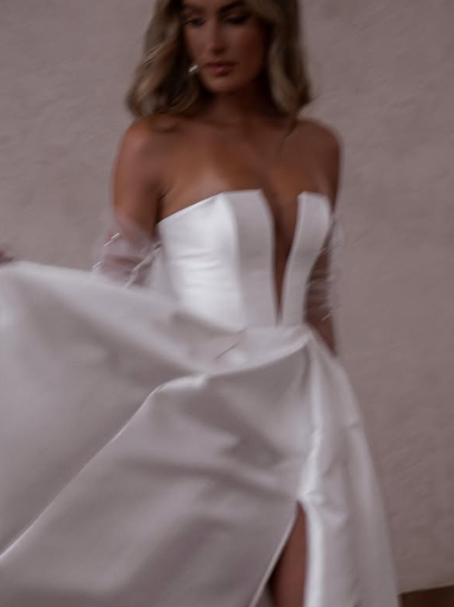 A Line Deep V Neck Satin Long Sweep Wedding Dress Prom Dress with Slit HZ1023