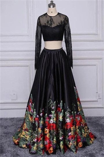 A line Two Piece Black Long Sleeve Prom Dress With Floral Print Skirt Evening Dresses HZ1023