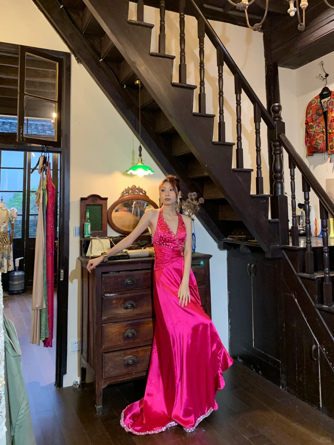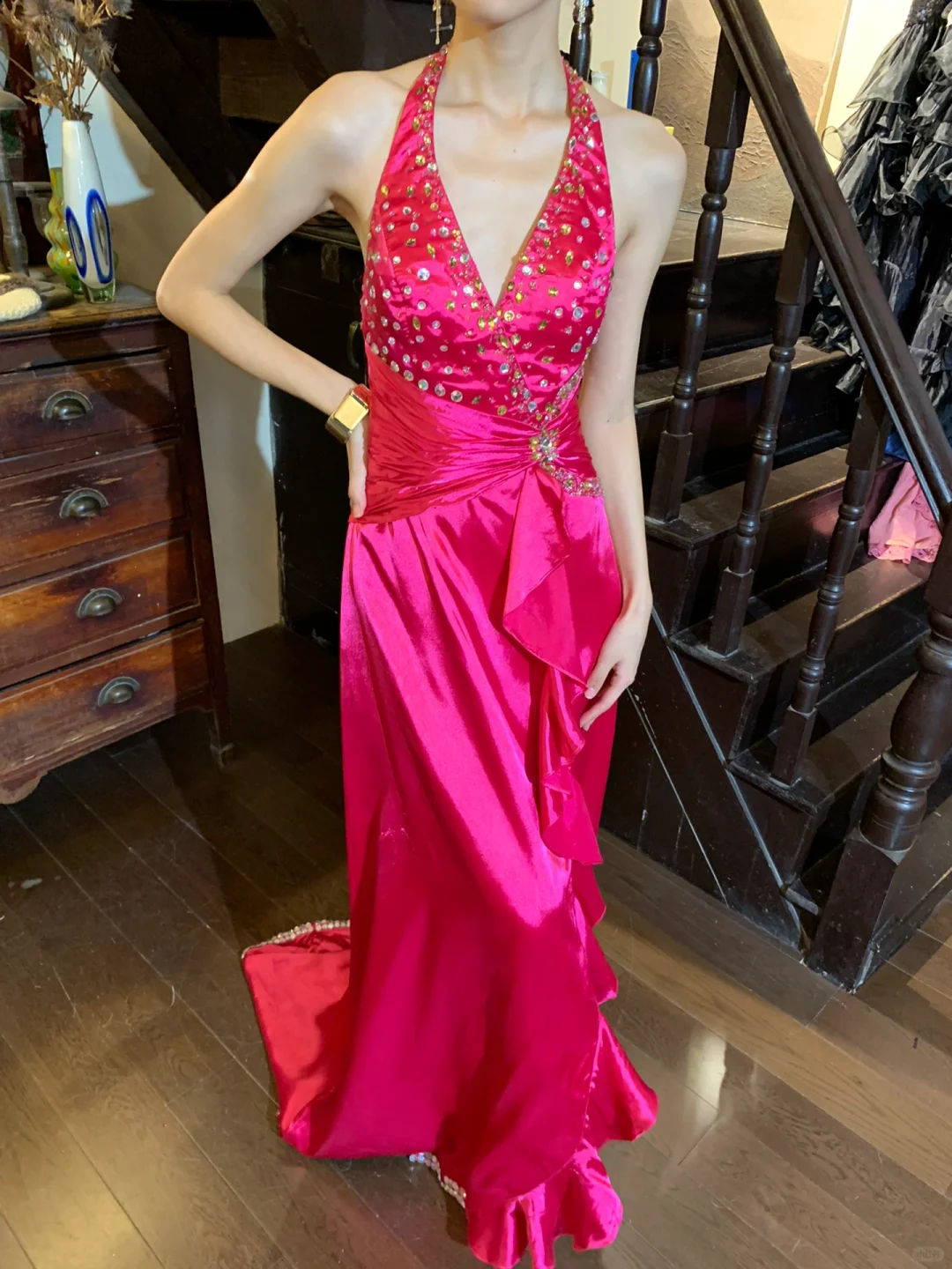 Barbie Pink Retro Mermaid Halter Beaded Ruffle Satin Party Dress Evening Dress HZ1023