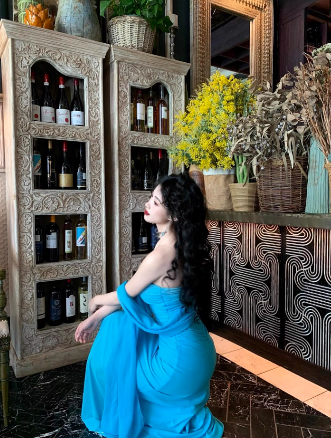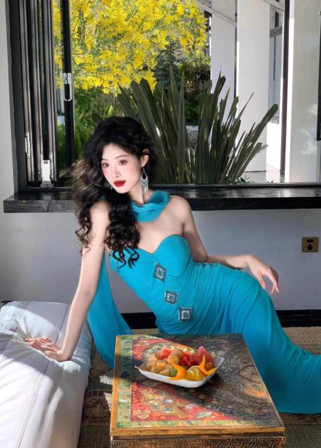 Blue Mermaid Strapless Beaded Chiffon Prom Dress Vacation Dress HZ1023