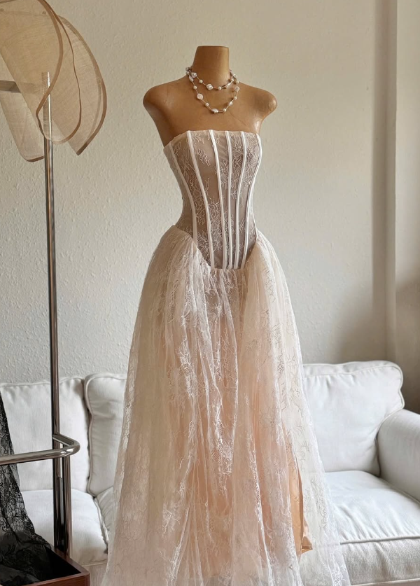 Champagne A Line Strapless Corset Lace Long Prom Dress Evening Dress HZ1023