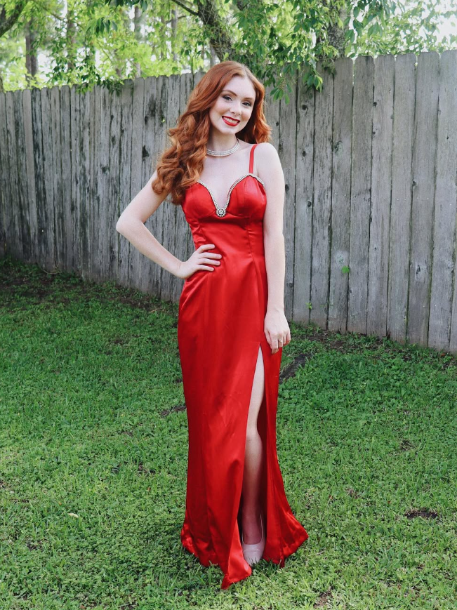 Charming Sheath Spaghetti Strap Rhinestone Red Satin Long Evening Dresses Party Dresses with Slit HZ1023