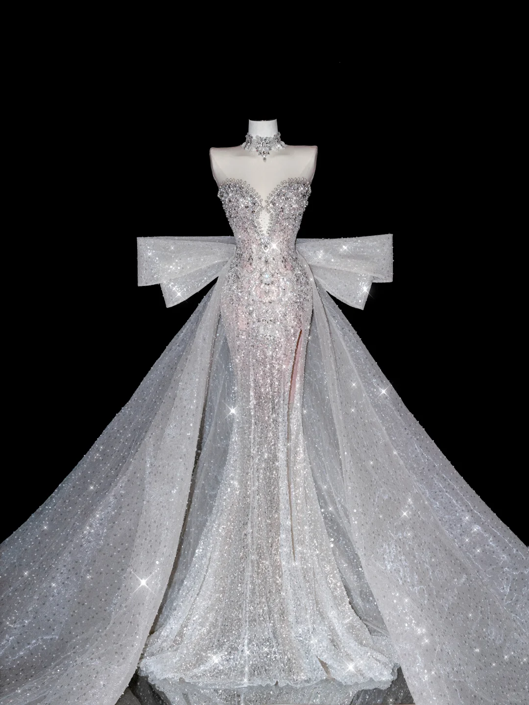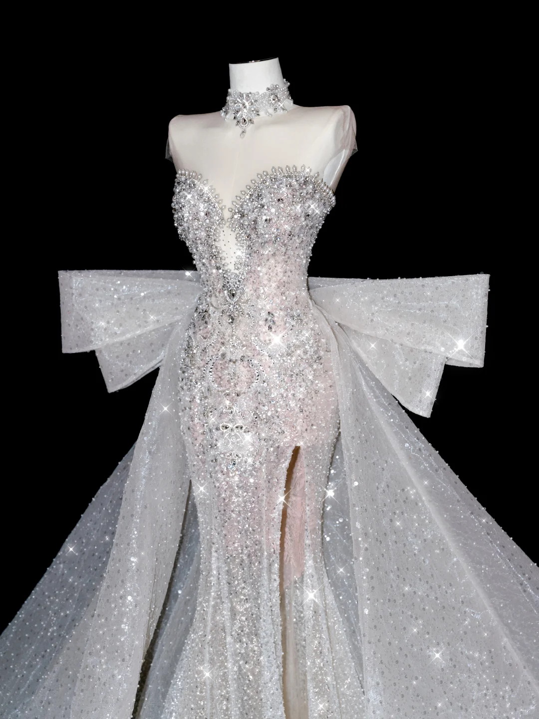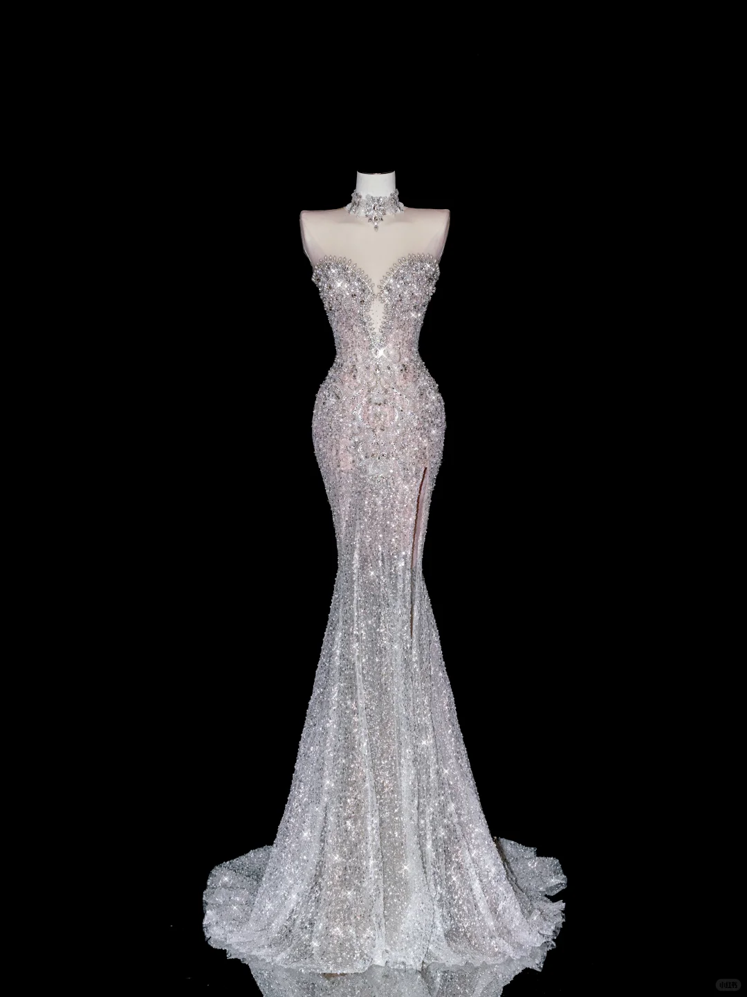 Exquisite Dreamy Mermaid Beaded Pearl Sequin White Tulle Prom Dress Party Dress with Slit HZ1023
