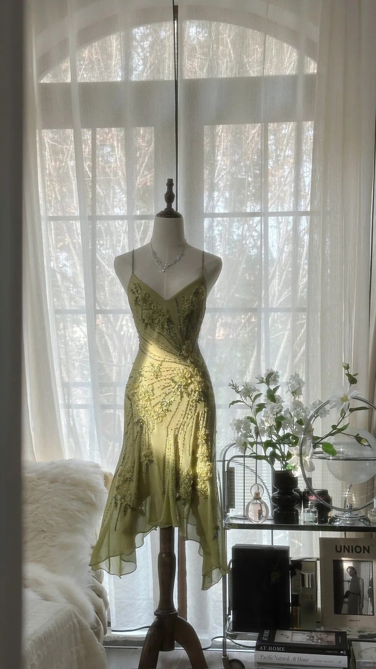 Gentle Mermaid Spaghetti Strap Beaded Flower Green Chiffon Party Dress Homecoming Dress HZ1023