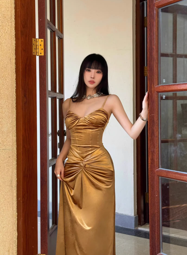 Golden A Line Spaghetti Strap Pleated Velvet Prom Dress Party Dress HZ1023