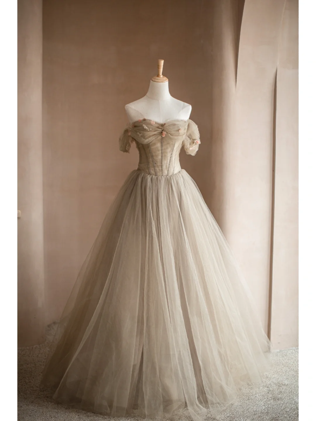 Light Camel A Line Off the Shoulder Floral Tulle Long Party Dress Prom Dress Formal Dress HZ1023