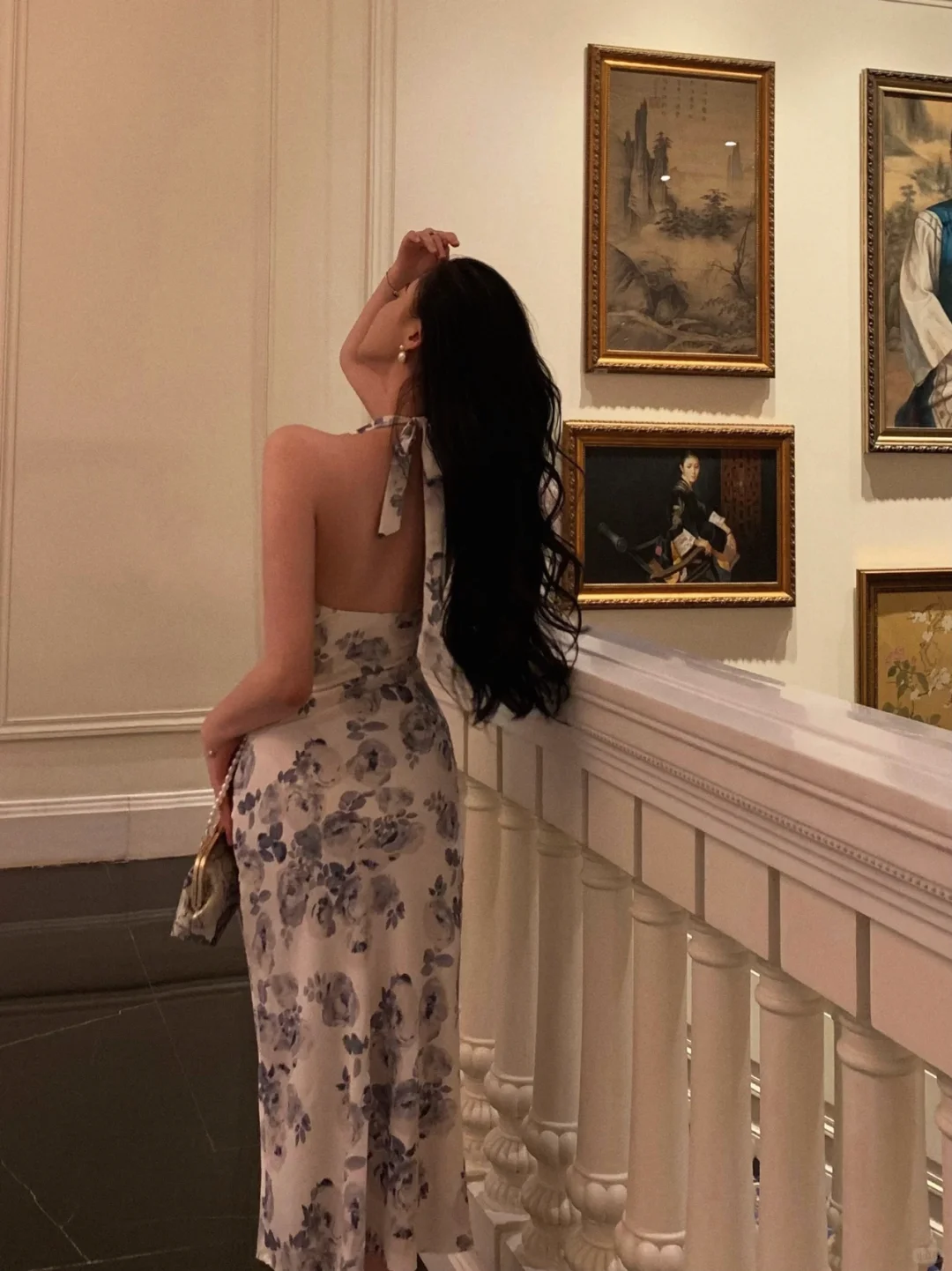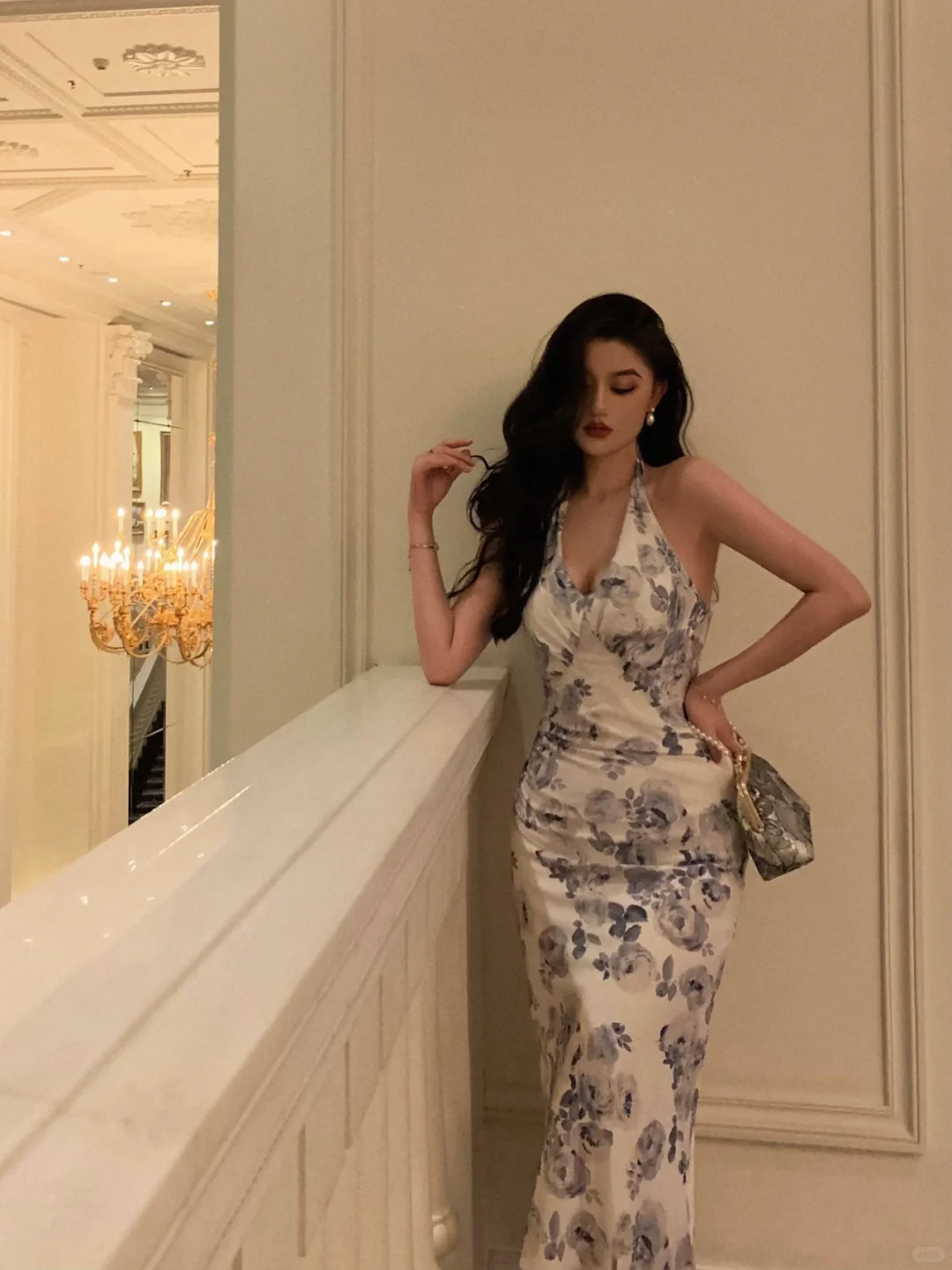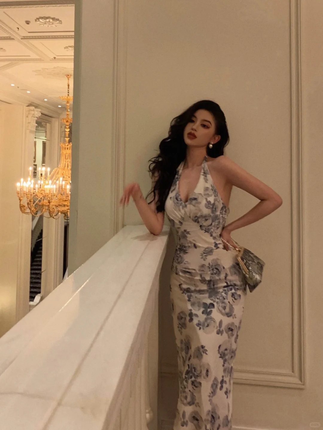 Lilac Sheath Halter Print Floral Chiffon Open Back Prom Dress Evening Dress HZ1023