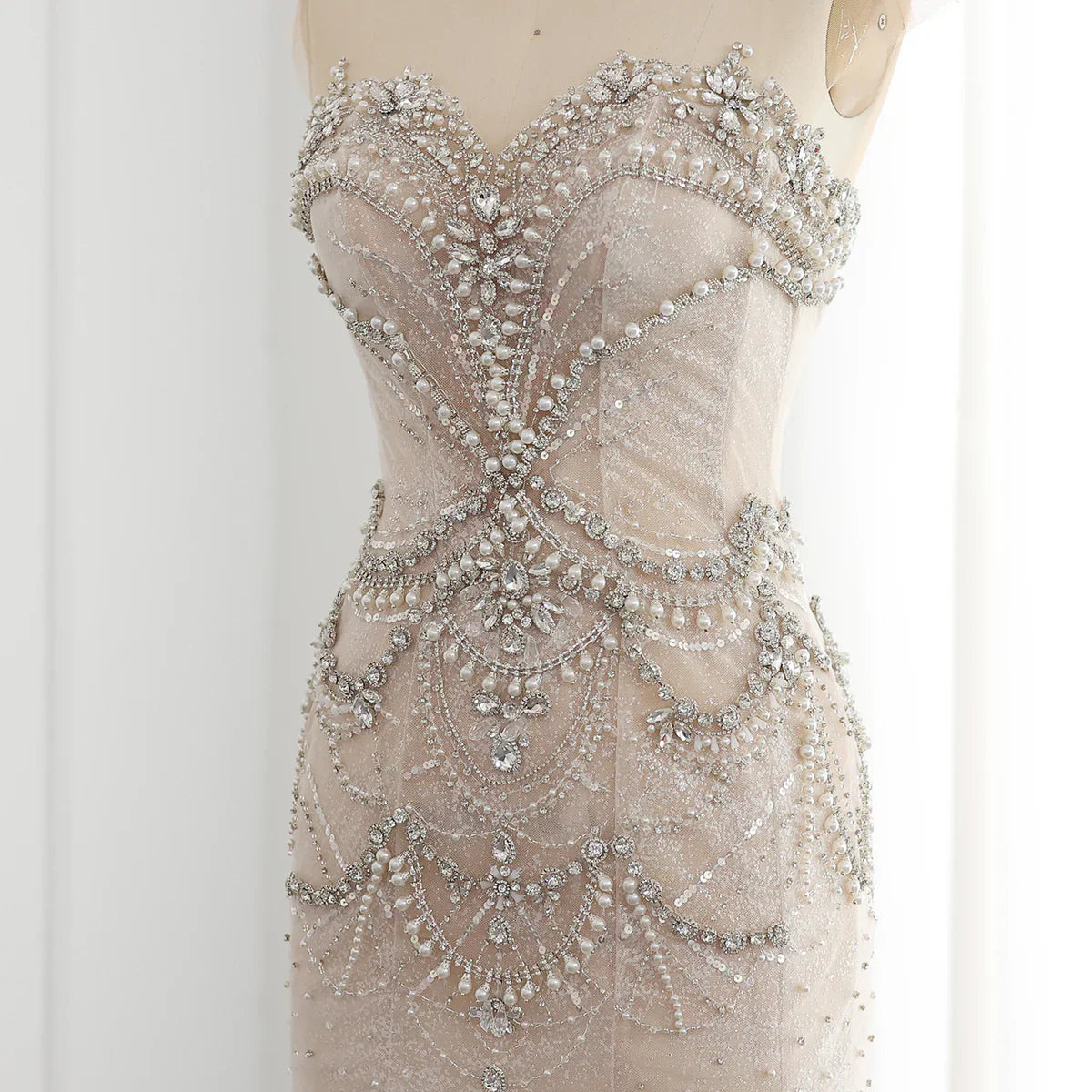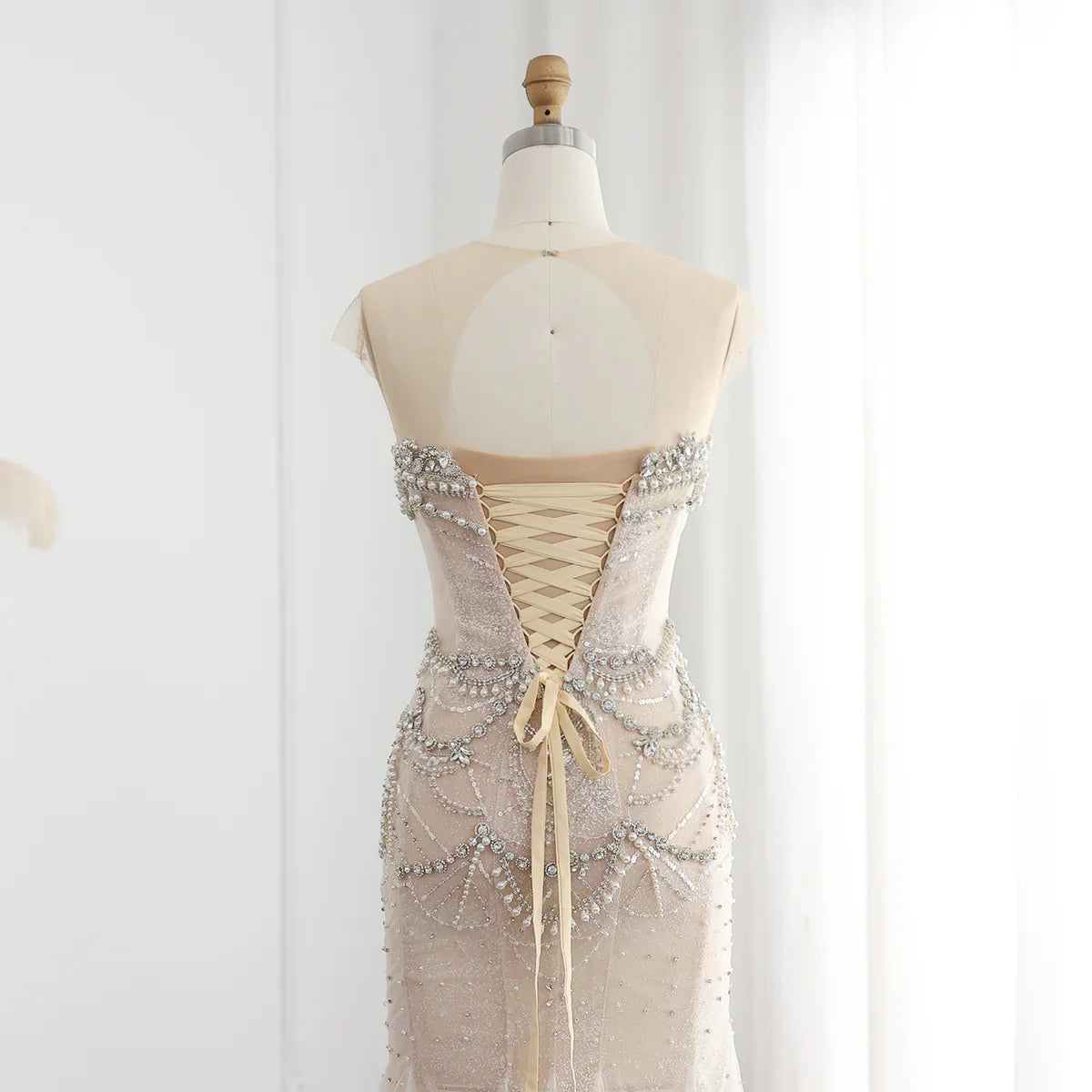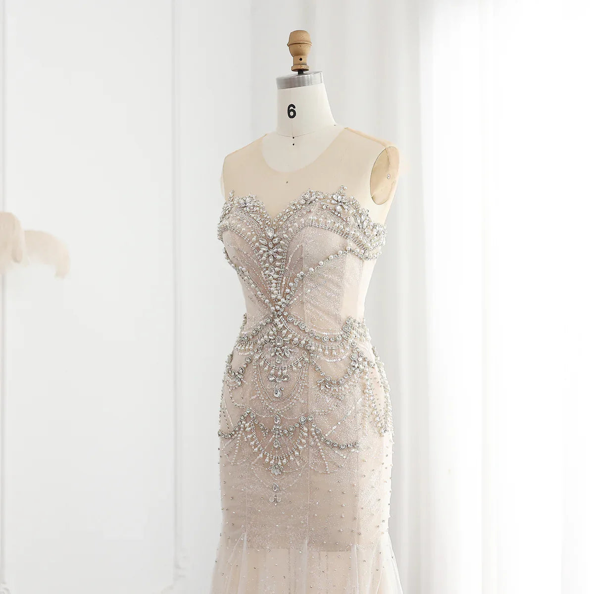 Luxury Mermaid Crystal Pearls Nude Tulle Long Prom Dress HZ1023