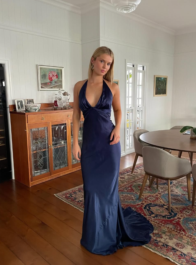 Navy Blue Sheath V Neck Satin Open Back Long Sweep Prom Dress Graduation Prom Dress HZ1023