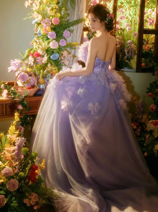 Purple Pretty Ball Gown Strapless Floral Tulle Prom Dress 16th Birthday Dress HZ1023
