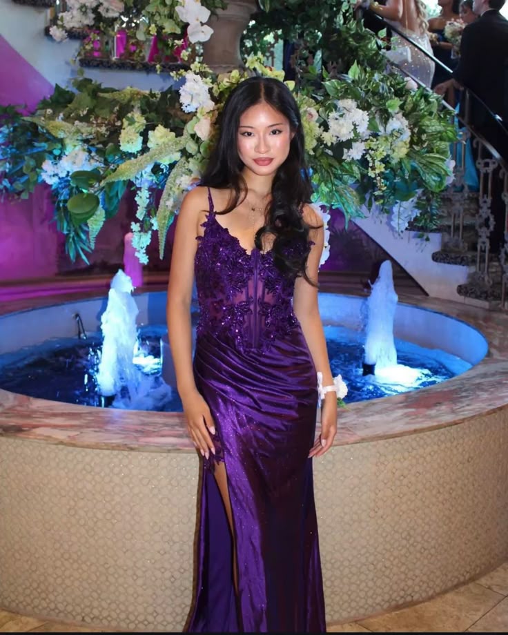 Purple Sheath Spaghetti Strap Appliques Satin Prom Dress Evening Dress with Slit HZ1023