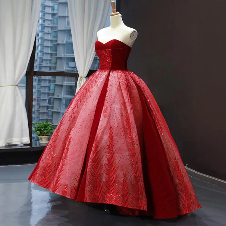 Red A Line Strapless Appliques Sequin Tulle Prom Dresses HZ1023