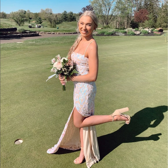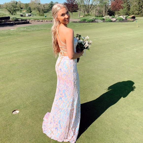 Sheath Spaghetti Strap Open Lace Up Back Sequin Satin Prom Dresses HZ1023