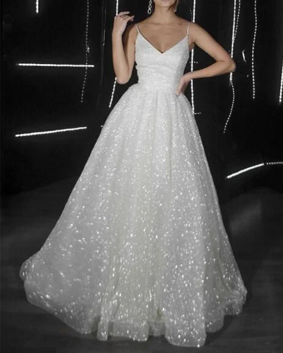 Shiny Spaghetti Straps Tulle Sequins Long Prom Dress Evening Dress Wedding Dress HZ1023