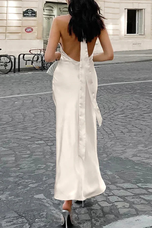 Simple Sheath Halter Light Champagne Satin Open Back Prom Dress Evening Dress HZ1023