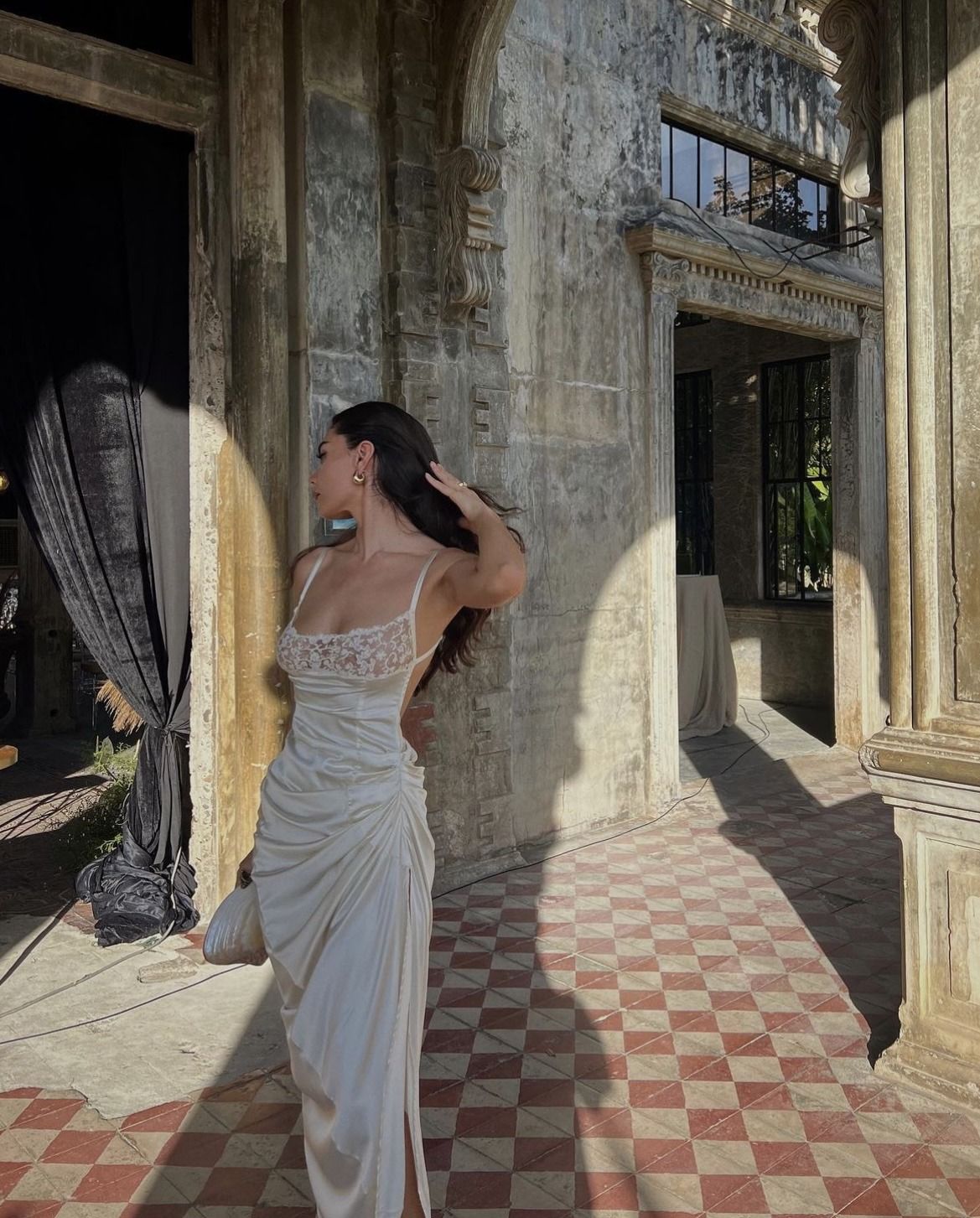 Simple Sheath Spaghetti Straps Pleated Lace Satin Open Back Prom Dress Party Dress HZ1023