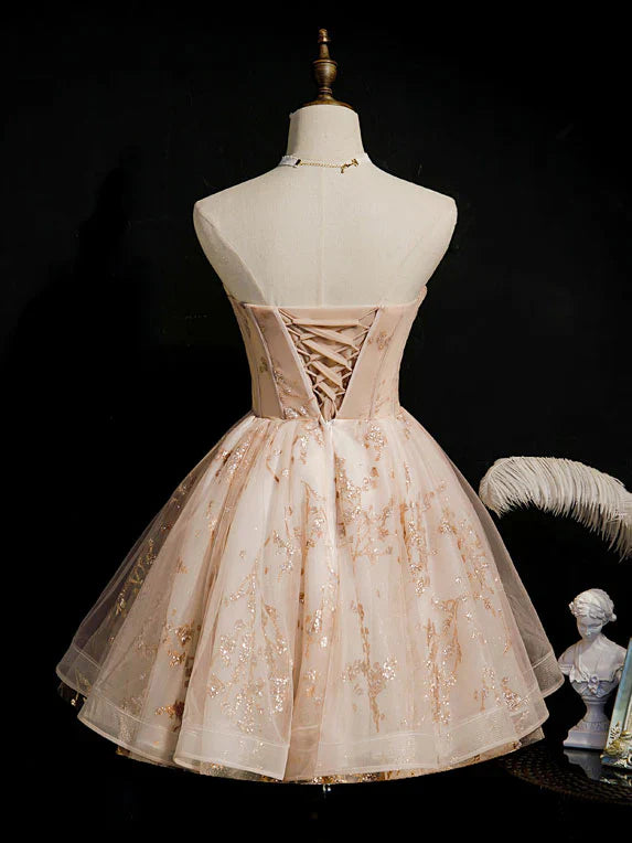 Strapless Champagne Beaded Tulle Short Prom Dress Homecoming Dress HZ1023