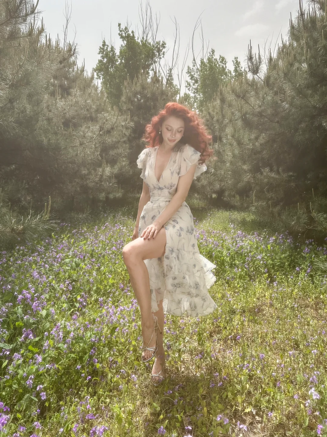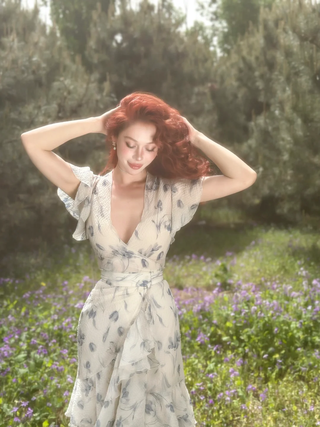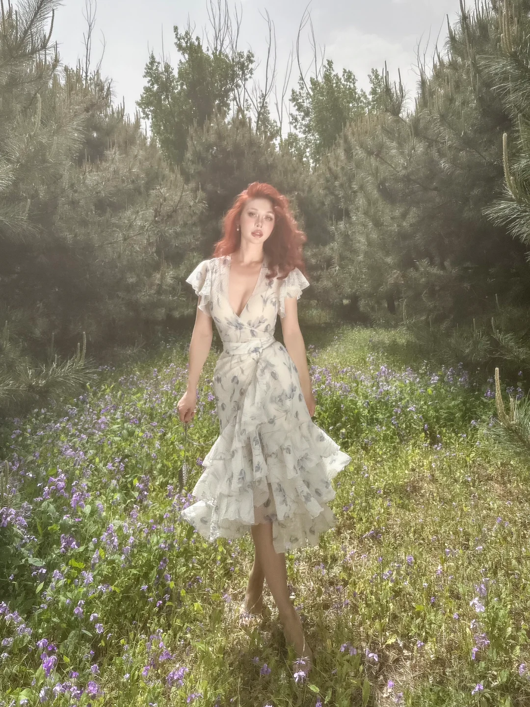 Vintage Mermaid V Neck Blue Print Floral Ruffle Chiffon Short Vacation Dress Outfits HZ1023