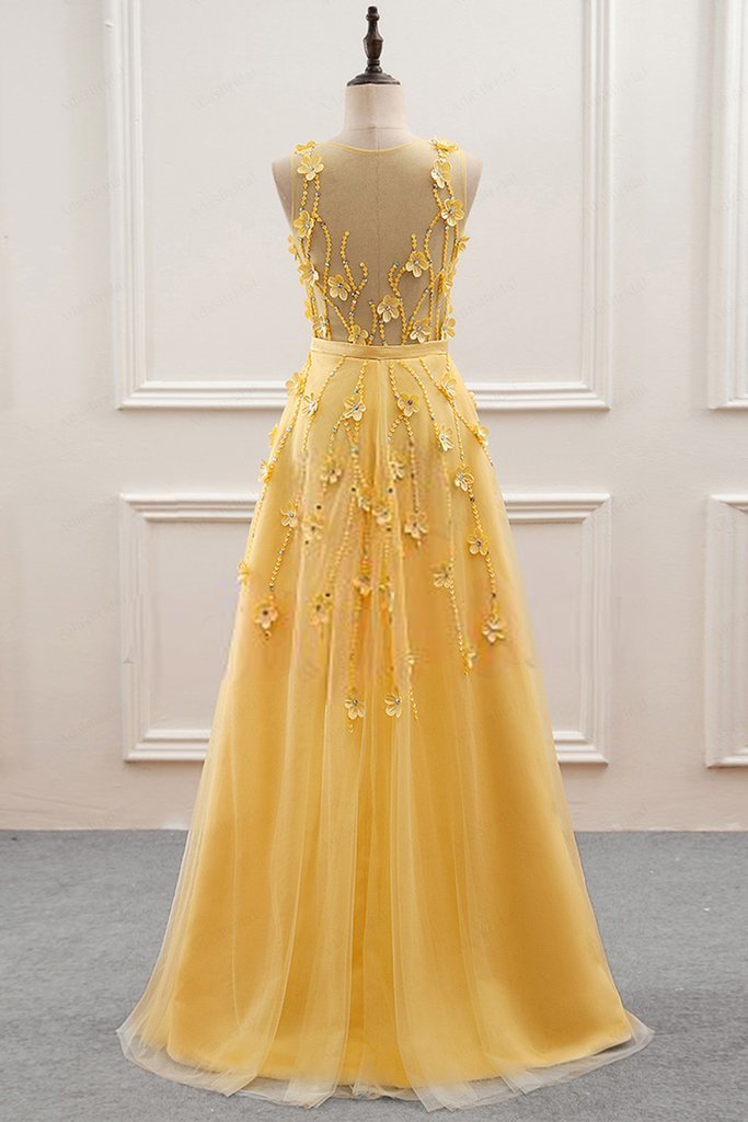 Yellow Flowers Tulle Long New Prom Dress, A-line Party Dress HZ1023